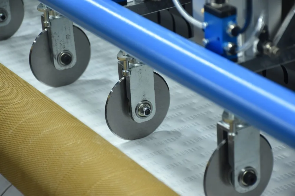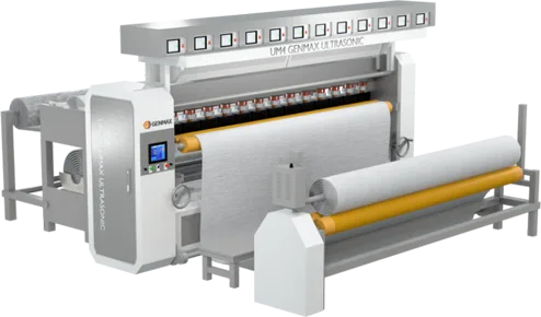GENMAX UM4 uses ultrasonic technology to bond fabrics without needles or thread. It handles materials up to 1000 GSM at 300-1200 meters per hour—3 to 5 times faster than traditional methods. Works with synthetic fabrics, polyester, cotton, and non-woven materials for custom patterns.