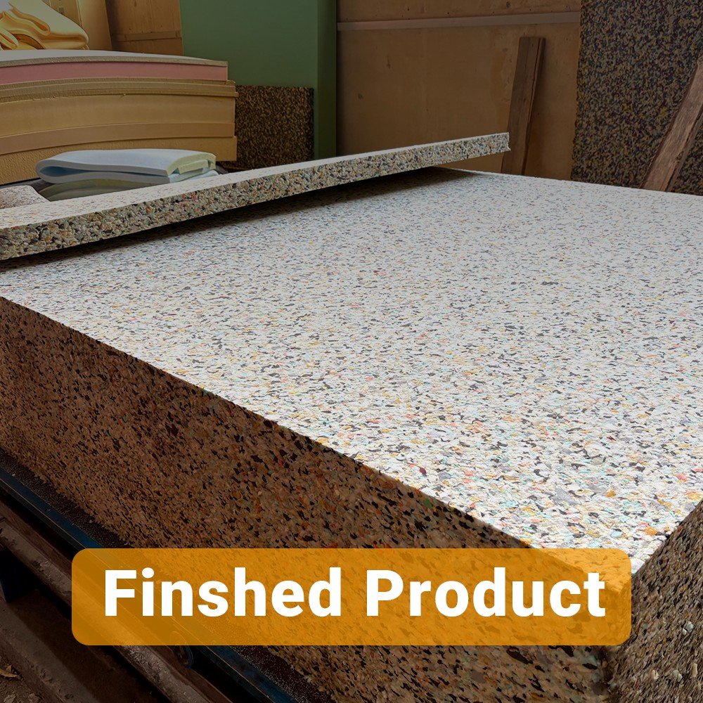 Our machines produce rebonded foam with densities from 50 kg/m³ (lightweight applications) to 150 kg/m³ (heavy-duty industrial use). Density is easily adjustable through pressure and chemical ratio controls.