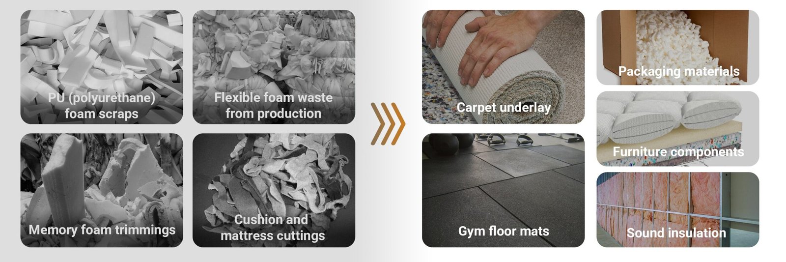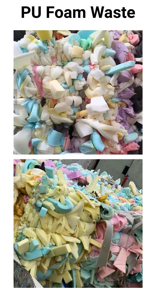Our machines handle all types of polyurethane foam waste including mattress scraps, furniture foam offcuts, carpet padding waste, and automotive foam components.
