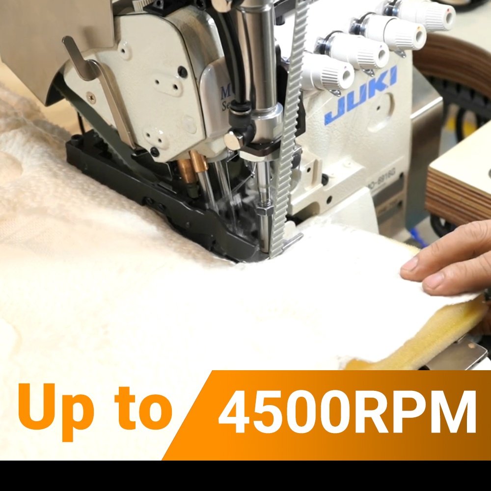 KB Series Heavy-Duty Flanging Machine sews ultra-thick mattress panels up to 90mm with HO HSING servo motor at 4,500 rpm. Features automatic presser foot lifting, encoder-controlled needle positioning, and vacuum removal system for mattress, upholstery, and home textile applications.
