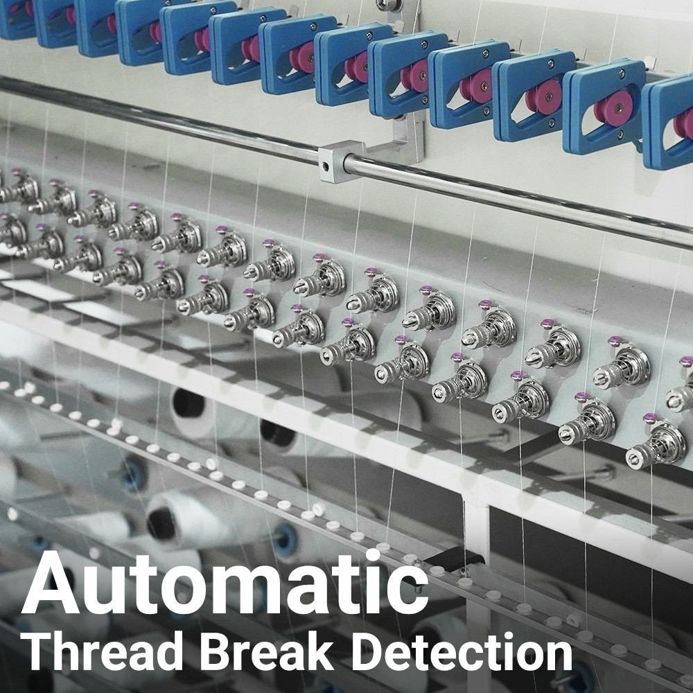 The machine includes comprehensive fault detection functions for both upper and bottom thread breaks, automatic stop motion control with immediate response to thread breakage, and emergency safety devices for operator protection.